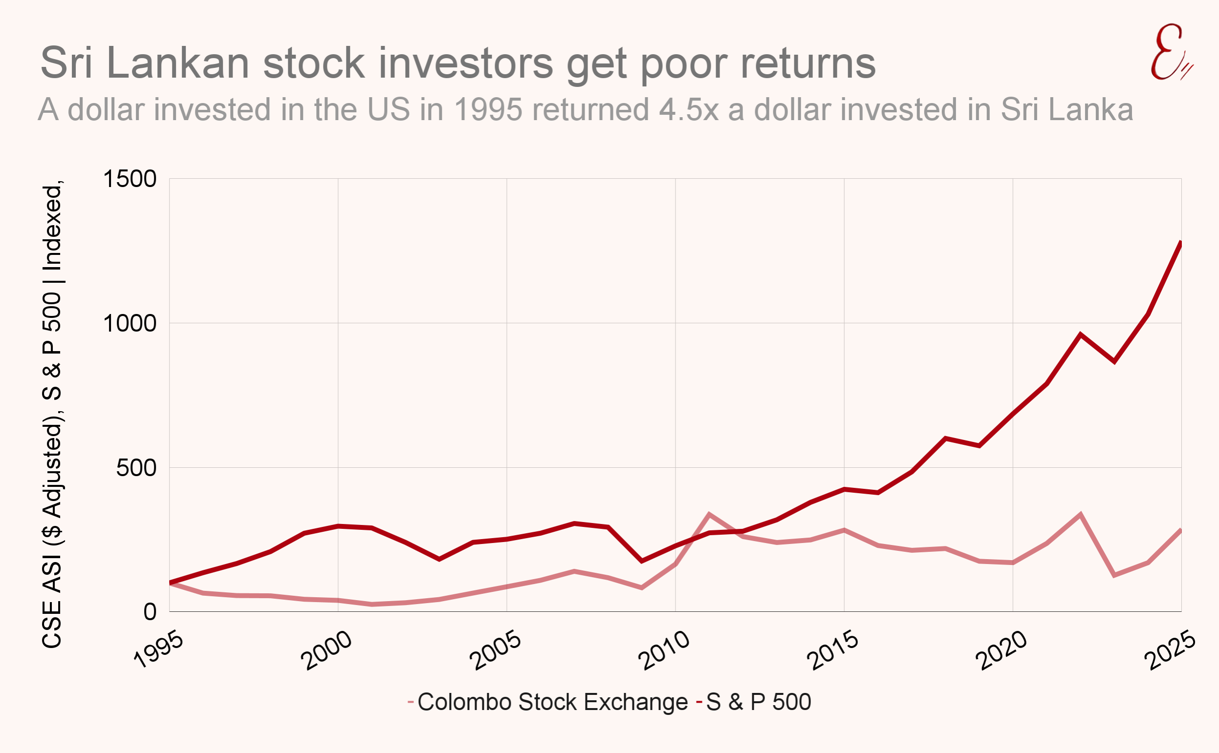 $100 invested in the US stock market in 1995 increased to $1250 by 2025. By contrast, a hundred dollars invested in the Colombo Stock Exchange only increased to $250. As a result Sri Lankan savers investing in the stock market saw their wealth grow less fast.