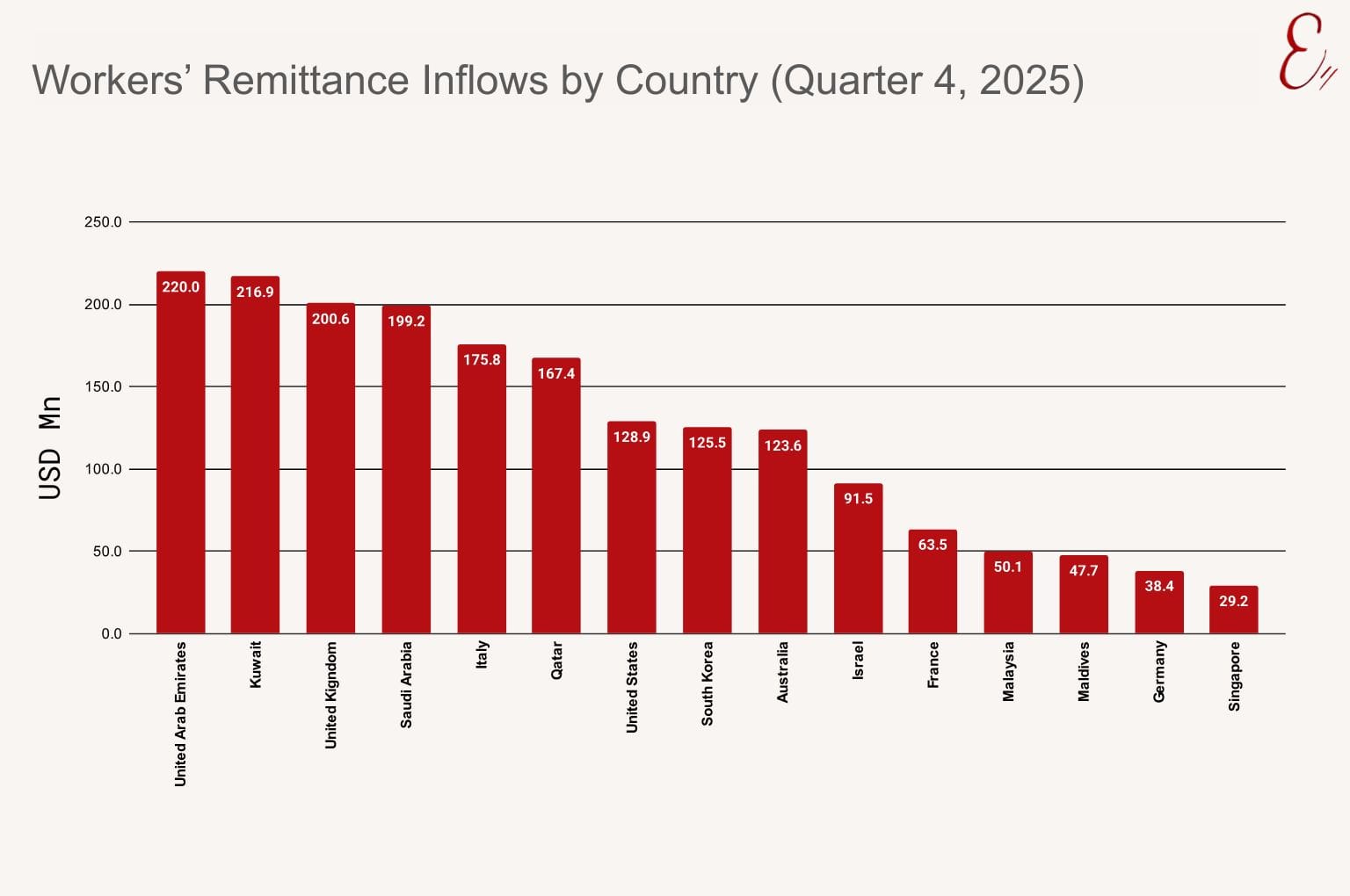 Sri Lanka’s economy — just beginning to recover from the economic crisis — is heavily reliant on migrant remittances. Remittances were $8.1 billion last year, growing by 23 percent compared to 2024. This figure is nearly half of Sri Lanka’s goods and services exports which in 2024 was $18.9 billion.